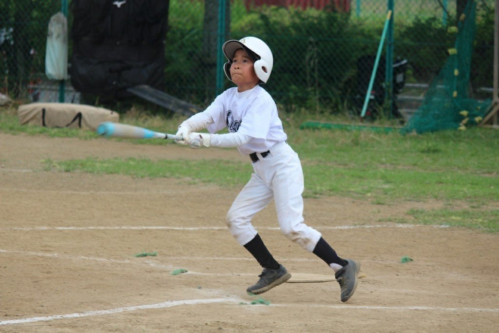 4年生になるとこのバットの軌道とフォロースルーが綺麗になりますね。バットが振れる体になってきているんです、きっと。ユウキは特に振りがキレイです。